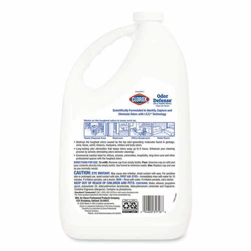 Tackle the toughest, smelliest odors with CloroxPro Clorox Odor Defense spray. With ICE Technology, Clorox Odor Defense is scientifically formulated to quickly identify, capture and eliminate odors from the air, leaving behind a clean air scent. This odor eliminator is suitable for use in most areas with the toughest odors. Odor Defense destroys the toughest odors, which include garbage, urine, vomit, feces, mildew, marijuana, tobacco, fire smoke, mildew and body odor, for up to 6 hours. Ideal for high traffic restrooms, offices, day care centers, schools, hotels, restaurants, athletic facilities, office breakrooms and waste disposal areas. Enhance your cleaning process by actively eliminating odors between cleanings.