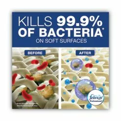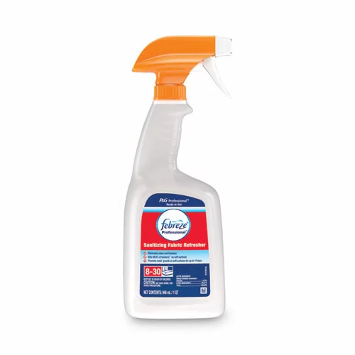 Soft surfaces that canāt be washed, such as mattresses and upholstered furniture, are harbors for harmful bacteria, mold and mildew. Febreze Professional Sanitizing Fabric Refresher gives you the same freshening power of Febreze plus the soft surface sanitization your environment needs. Proprietary technology goes to the source of odors and fights them. A light, fresh scent is left behind to leave the treated area smelling fresh and clean. Safe for virtually all fabrics. Spray soft surface until fully wet and the soft surface must remain wet for five minutes.