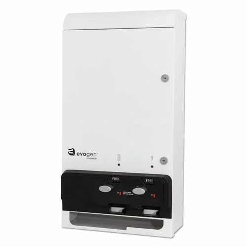 Evogen™ dispensers make stocking and dispensing more convenient than ever before. The modern streamlined styling is attractive and easy to use. Easy loading promotes consistent stocking. Push-button dispensing makes product quickly and conveniently accessible to all women.