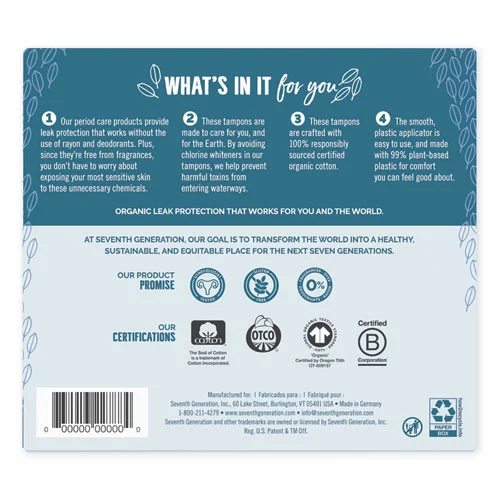 When you get your period, you want free and clear menstrual care that keeps up with your active lifestyle and helps support Menstrual Equity for everyone. Seventh Generation’s 100% Organic Cotton Tampons do both. Packaged in a fresh new look that feels like you, our tampons give the long-lasting, dual-layer leak protection you expect (without rayon or deodorants) and feature a smooth-comfort applicator made with 99% plant-based plastic. They’re also free from fragrances, so your most sensitive skin isn’t exposed to unnecessary chemicals. Since we’re donating 43¢ for every pack of tampons and pads we sell (up to 1 million) to impactful nonprofits who are fighting for safe and affordable period care for all, you’re helping strengthen our mission to make Menstrual Equity a reality.